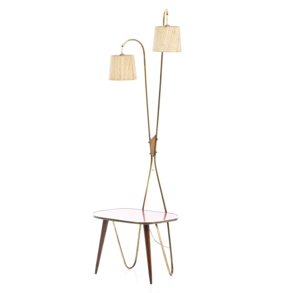Portugal, c. 1950, estrutura em metal, com mesa incorporada em madeira com tampo em fórmica, com dois focos com abtjour em tecido. Sinais de uso. Dim.:170x52 cm